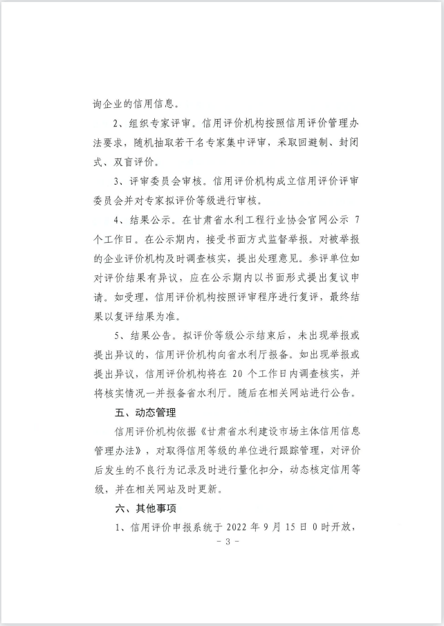 【信用評(píng)價(jià)】甘肅省水利工程行業(yè)協(xié)會(huì)關(guān)于開展全省水利建設(shè)市場(chǎng)主體信用評(píng)價(jià)工作的通知特別提示:信用評(píng)價(jià)申報(bào)系統(tǒng)自2022年9月15日0時(shí)正式啟動(dòng)至2022年10月15日24時(shí)關(guān)閉,為了便于協(xié)會(huì)與參評(píng)單位溝通銜接,協(xié)會(huì)建立六類(施工、監(jiān)理、設(shè)計(jì)、檢測(cè)、招標(biāo)代理、制造供貨)微信群,請(qǐng)各參評(píng)單位按照各自的類別聯(lián)系協(xié)會(huì)工作人員入群。